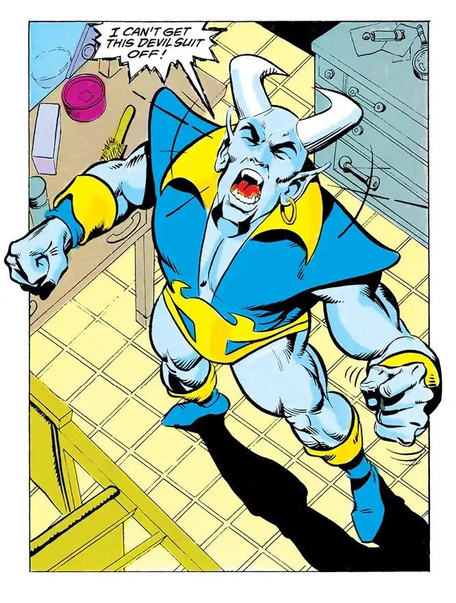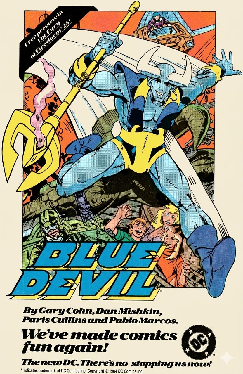 The Blue Devil character, introduced by DC Comics in 1984, is a fascinating blend of superhero tropes and supernatural elements. Created by Dan Mishkin, Gary Cohn, and Paris Cullins, Blue Devil first appeared in a special insert in ‘Fury of Firestorm #24’ before getting his own series. The character, Daniel Cassidy, is a stuntman and special effects designer who becomes bonded with a demonically-possessed suit while on a movie set. This twist of fate grants him superhuman abilities and an imposing blue-skinned appearance, setting the stage for a narrative that explores themes of identity, destiny, and the supernatural.